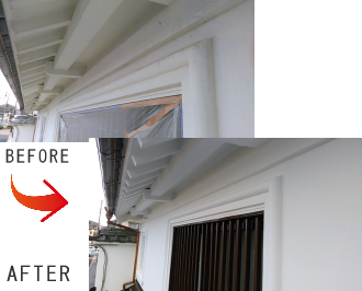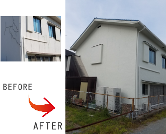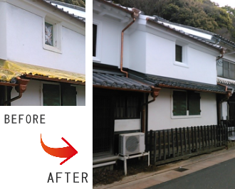 古民家住宅の外壁はなんといっても漆喰の白が映えます。漆喰は消石灰を主成分とした消臭・調湿効果のある塗り壁材ですが時間とともに汚れてきます。高い技術でまるで漆喰を塗り替えたような仕上げになっています。